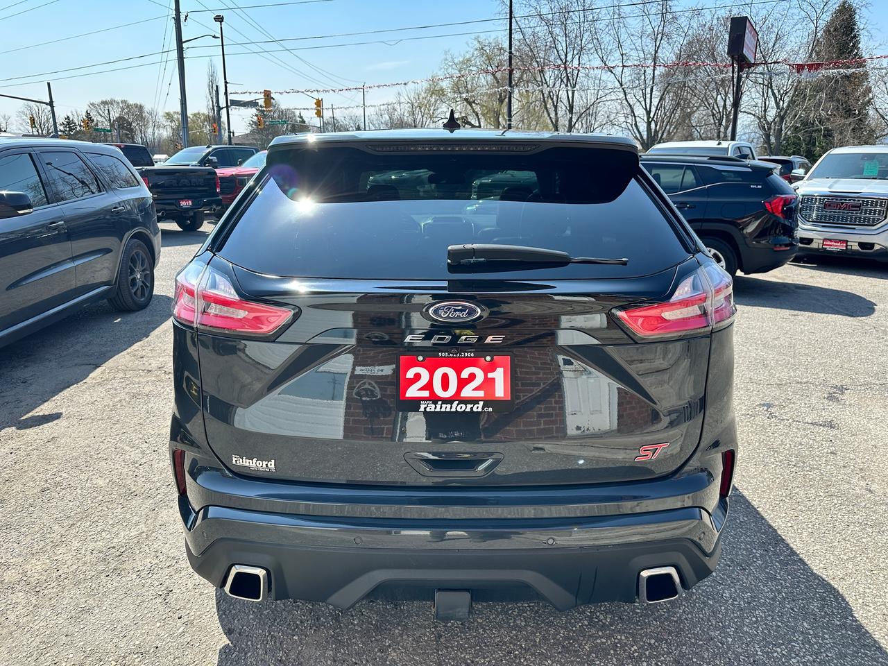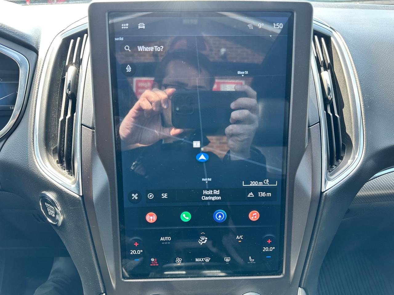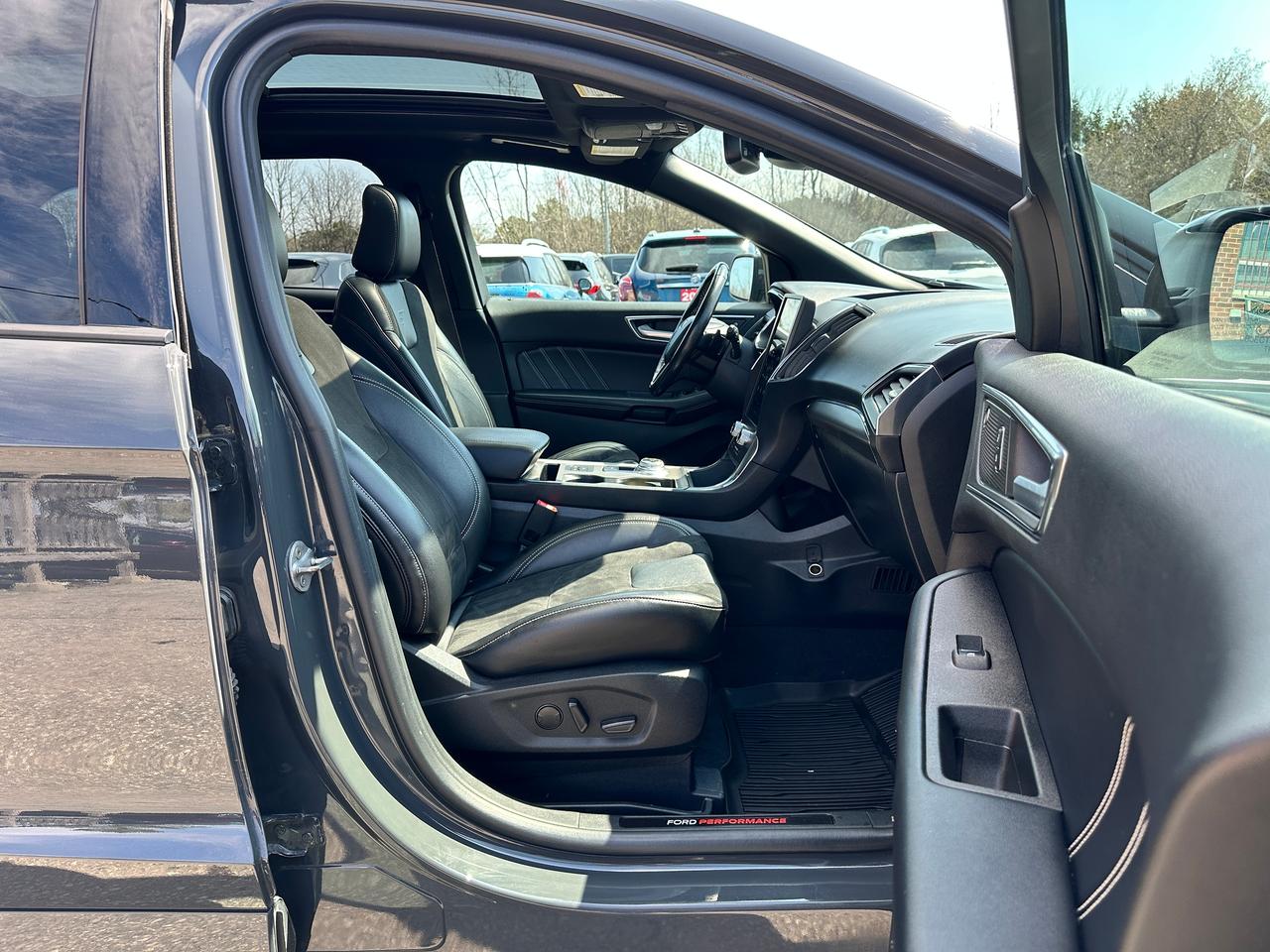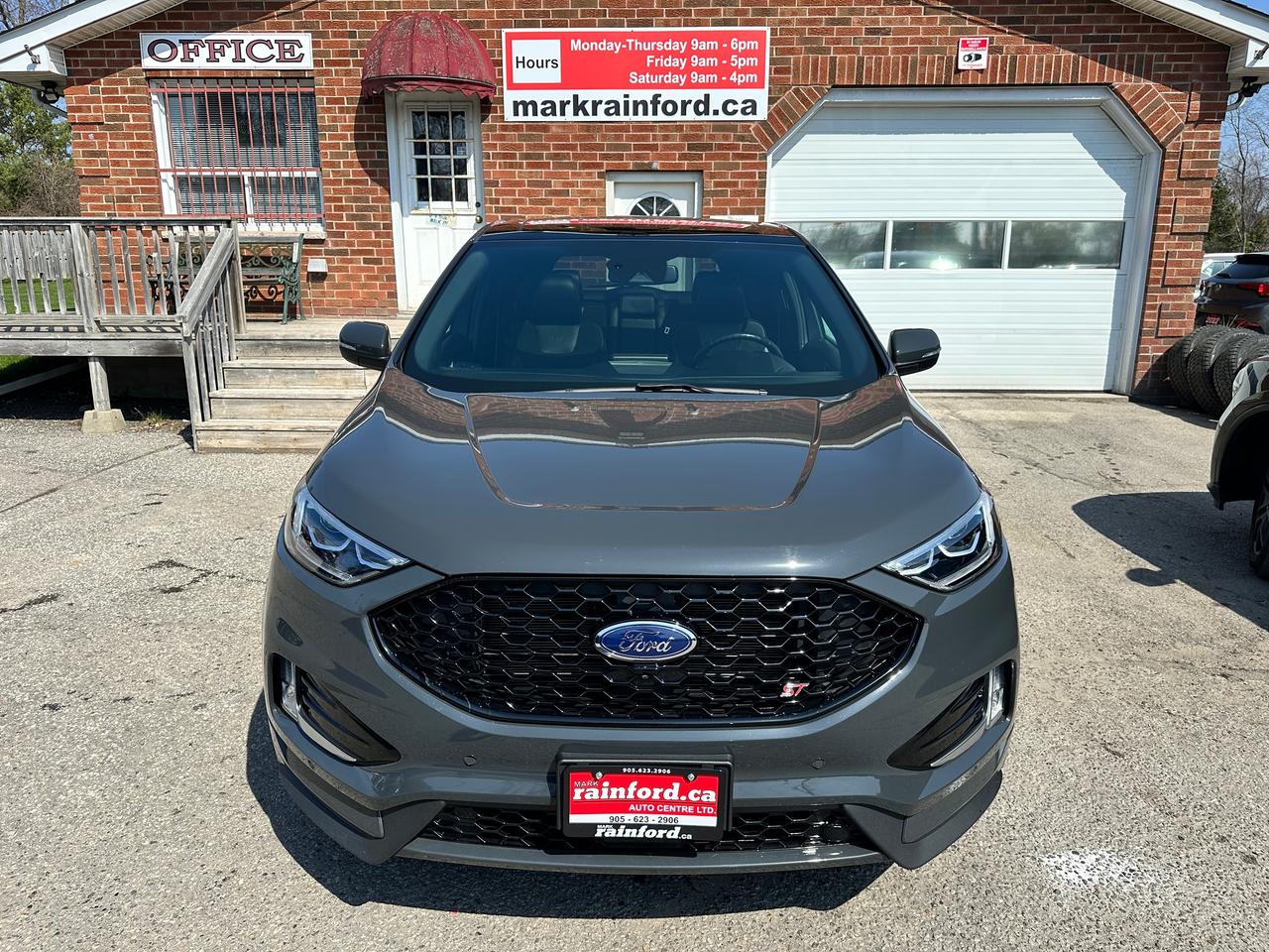 WOW! Super-Clean Ford Edge from Thornhill, ON! This ST AWD model looks incredible in its Dark Charcoal Grey paint and factory alloy wheels, with fantastic options inside and out! The exterior features keyless entry with remote start and proximity key, power rear lift-gate, an enormous Panoramic Sunroof, colour-matched side mirrors with integrated turn signals, forward collision warning and adaptive cruise controls, blind spot and parking sensors, rear traffic warning and lane keeping assist, sporty dual-rear exhaust, a trailer hitch, tinted rear privacy glass and sleek spoiler, ST Badging, gorgeous factory Black Alloy Wheels and NEW All-Season Tires freshly installed, a powerful and smooth 2.7L V6 Turbocharged Engine and Automatic transmission powering the All-Wheel-Drive system! The interior is clean and comfortable with heated and cooled power-adjustable front leather seating with lumbar controls and driver's memory settings, spacious heated rear seating, power door locks, windows and mirrors, All-Weather-Floor mats, and a rear cargo mat, a heated leather wrapped steering wheel with Audio and Cruise controls, paddle shifters, an easy-to-read and use gauge cluster, push button start, a HUGE Central touch screen AM/FM/XM Satellite HD Radio with Bang & Olufsen Premium Audio, Bluetooth, Apple CarPlay, Navigation, Backup Camera and 360 Surround Parking Sensor Display and entertainment applications, Dual-Zone A/C climate controls with front and rear window defrost settings, Parking Assistance Settings, Automatic-Stop/Start Override button, USB/USB-C/12V accessory ports, Universal Garage Door openers and more!