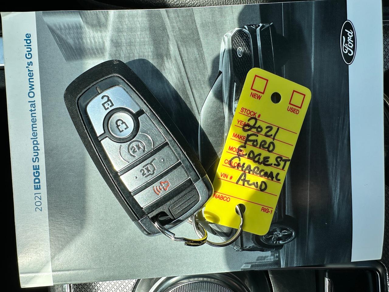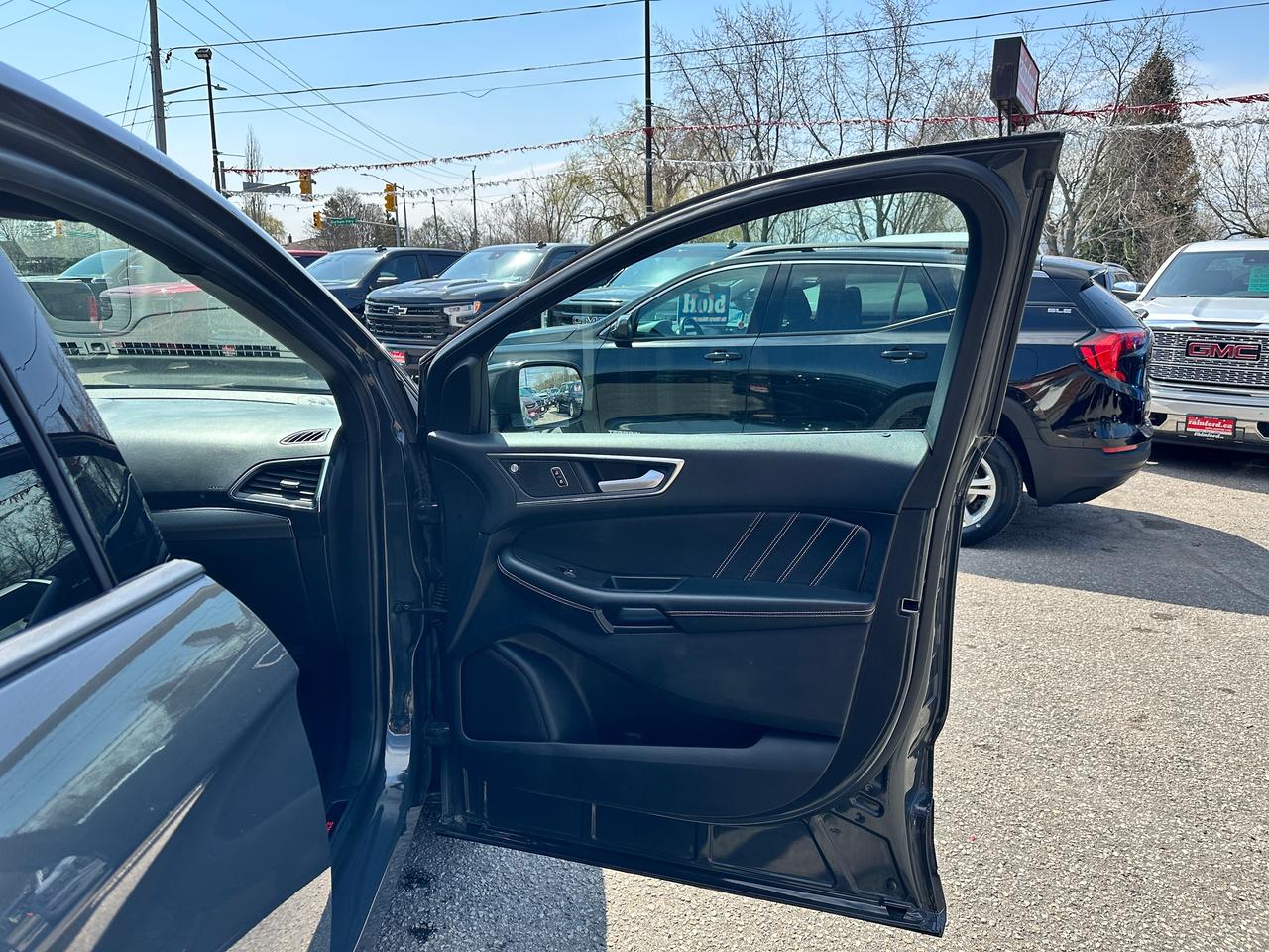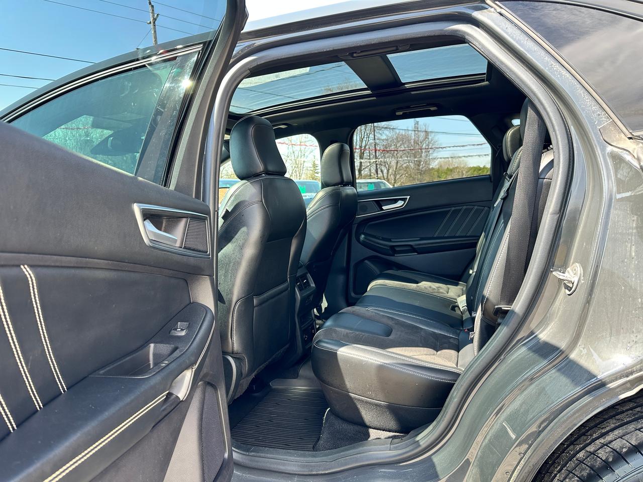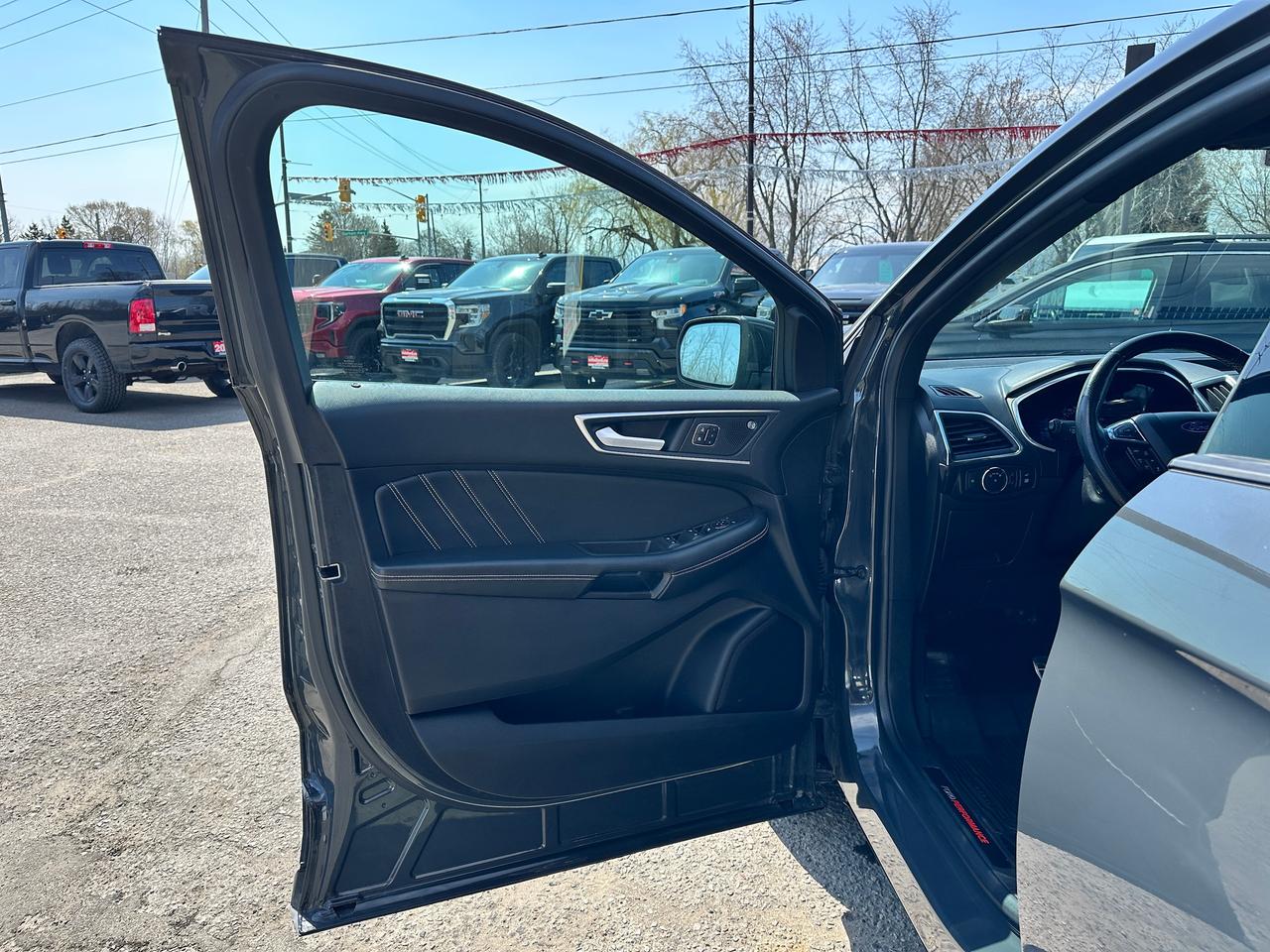 WOW! Super-Clean Ford Edge from Thornhill, ON! This ST AWD model looks incredible in its Dark Charcoal Grey paint and factory alloy wheels, with fantastic options inside and out! The exterior features keyless entry with remote start and proximity key, power rear lift-gate, an enormous Panoramic Sunroof, colour-matched side mirrors with integrated turn signals, forward collision warning and adaptive cruise controls, blind spot and parking sensors, rear traffic warning and lane keeping assist, sporty dual-rear exhaust, a trailer hitch, tinted rear privacy glass and sleek spoiler, ST Badging, gorgeous factory Black Alloy Wheels and NEW All-Season Tires freshly installed, a powerful and smooth 2.7L V6 Turbocharged Engine and Automatic transmission powering the All-Wheel-Drive system! The interior is clean and comfortable with heated and cooled power-adjustable front leather seating with lumbar controls and driver's memory settings, spacious heated rear seating, power door locks, windows and mirrors, All-Weather-Floor mats, and a rear cargo mat, a heated leather wrapped steering wheel with Audio and Cruise controls, paddle shifters, an easy-to-read and use gauge cluster, push button start, a HUGE Central touch screen AM/FM/XM Satellite HD Radio with Bang & Olufsen Premium Audio, Bluetooth, Apple CarPlay, Navigation, Backup Camera and 360 Surround Parking Sensor Display and entertainment applications, Dual-Zone A/C climate controls with front and rear window defrost settings, Parking Assistance Settings, Automatic-Stop/Start Override button, USB/USB-C/12V accessory ports, Universal Garage Door openers and more!