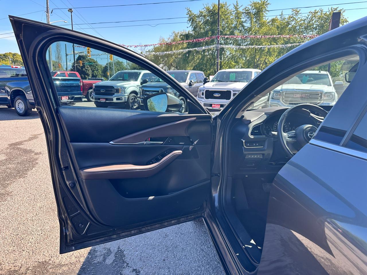 WOW! Super-Clean Mazda CX-30 from Kingston, ON! This GT AWD model looks absolutely stunning in its Grey paint and factory alloy wheels, with amazing options and styling! The exterior features keyless entry, automatic headlights and high beams, a factory power sunroof, colour-matched side mirrors with integrated turn signals, tinted privacy glass, a sporty dual rear exhaust, forward collision warning and adaptive cruise settings, lane departure warning, parking sensors, gorgeous factory split spoke dark alloy wheels, a peppy fuel-efficient 2.5L 4-cylinder Engine and Automatic transmission powering the All-Wheel-Drive system! The interior is clean and comfortable with heated leather front seats with driver's power adjustment, lumbar control and memory settings, power door locks, windows and mirrors, a heated leather wrapped steering wheel with Audio and Cruise controls, an easy to read and use gauge cluster, push button start, central AM/FM/XM Satellite HD Radio with Bluetooth, Navigation, Apple CarPlay, Android Auto, and Backup Camera, Dual-Zone A/C climate control with front and rear window defrosts settings, USB/12V accessory ports, Terrain assist, SPORT Driving mode, and more!