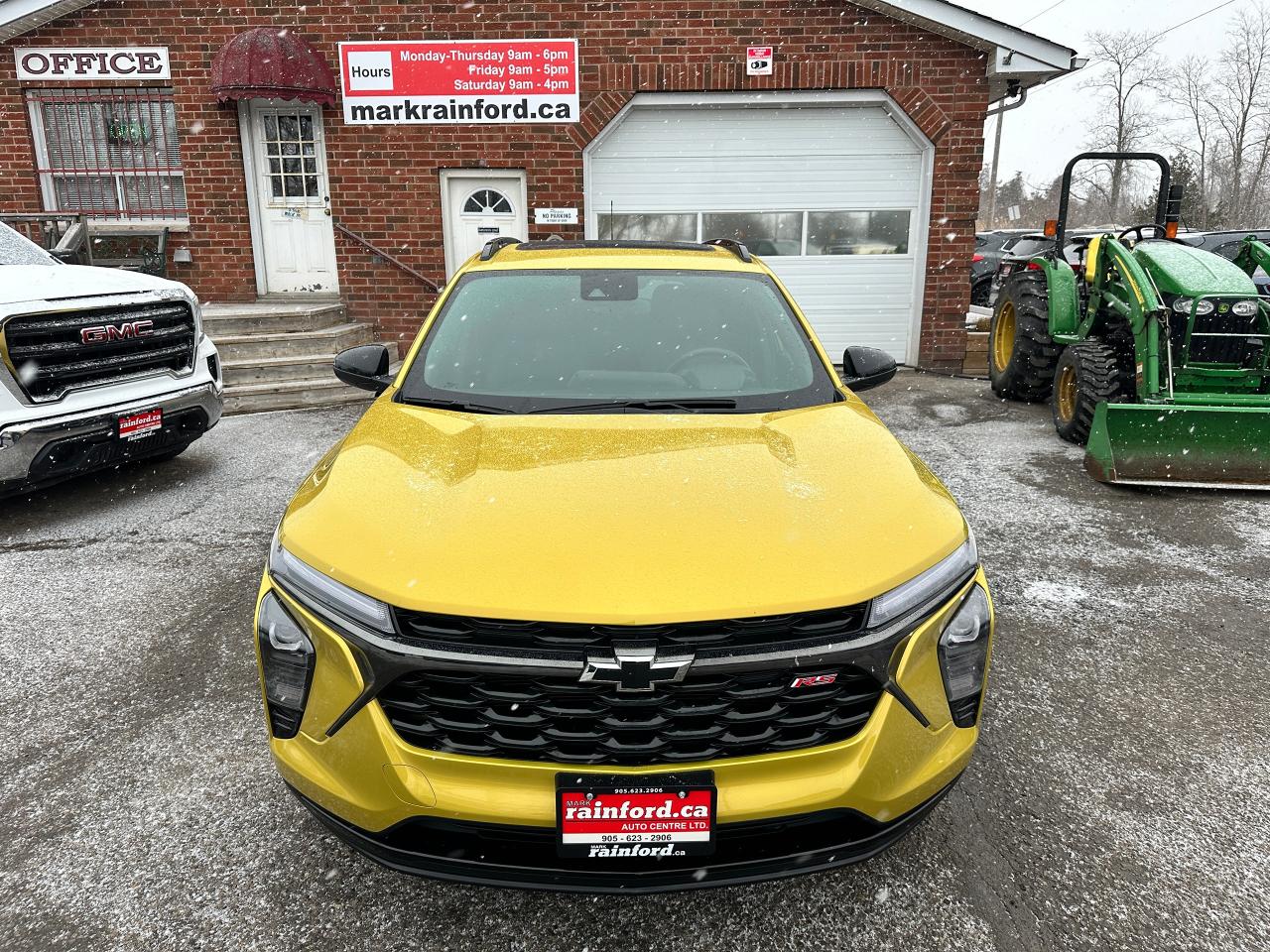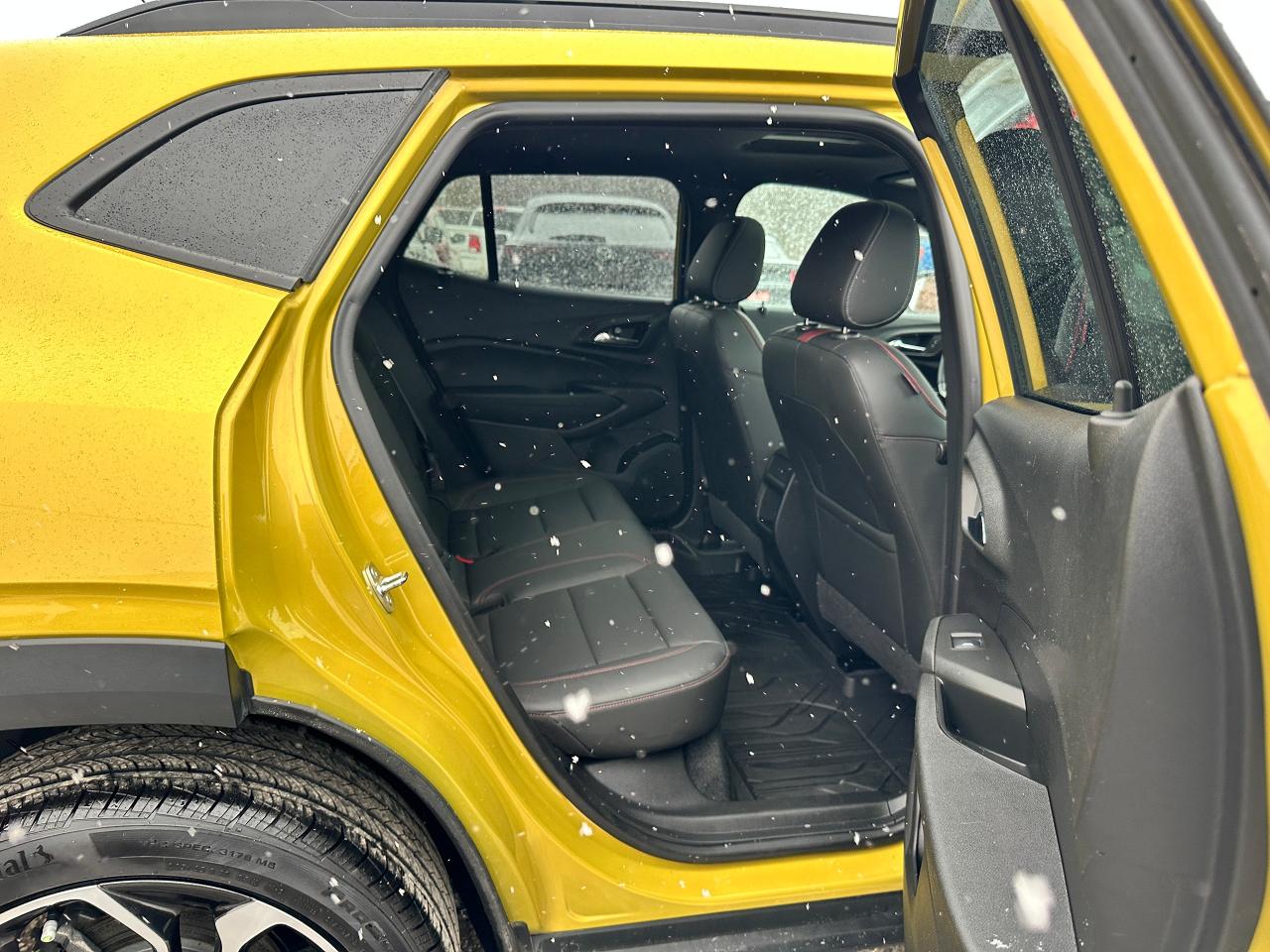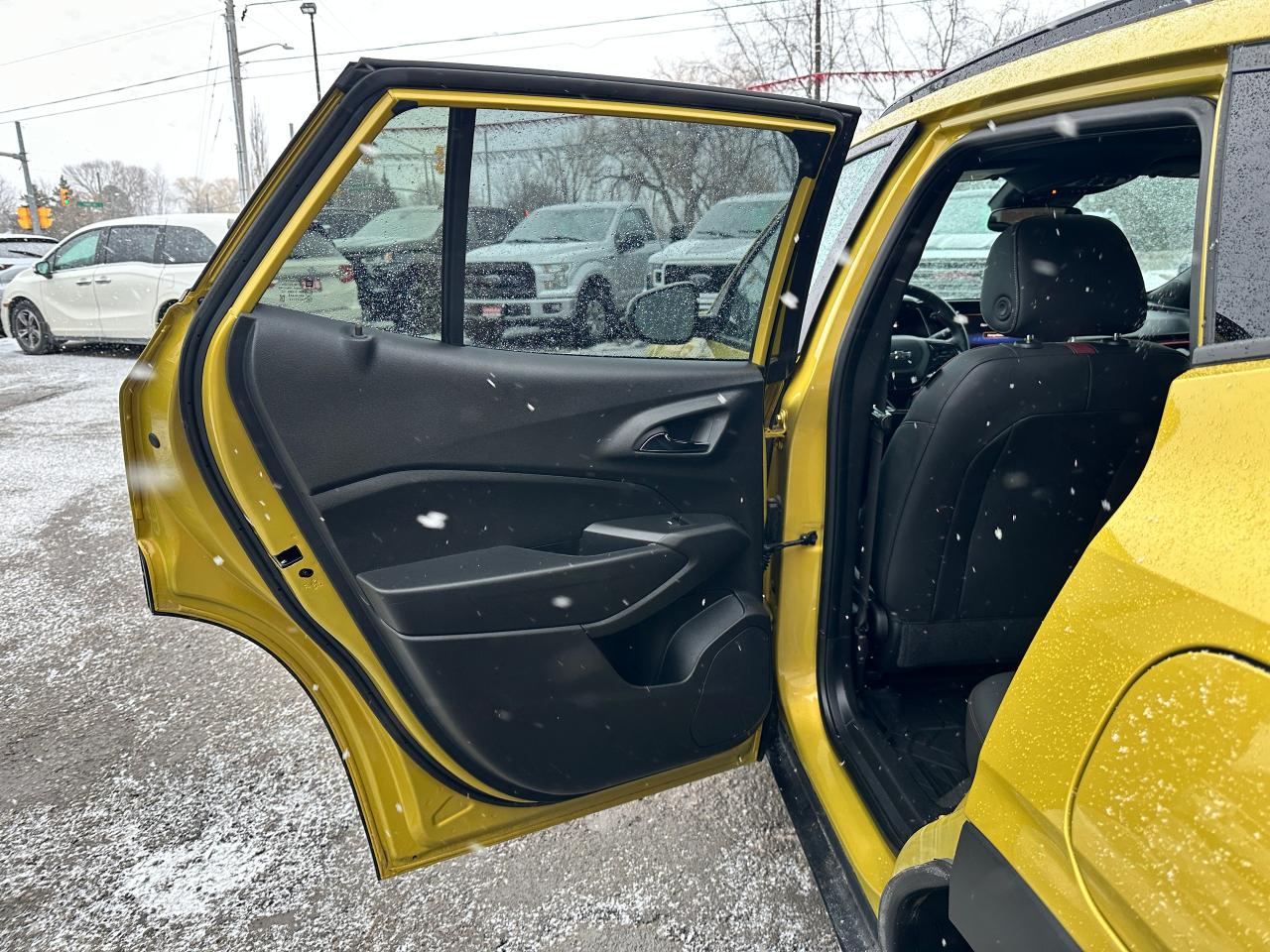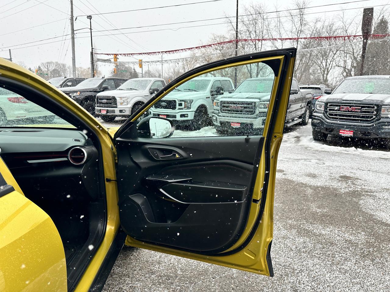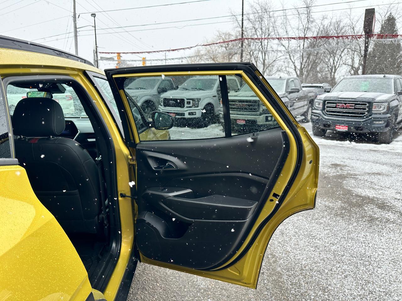 WOW! Ultra-Clean LOW KM Chevrolet Trax from Belleville, ON! This 2RS FWD model looks stunning in its shimmering Yellow paint and Factory Alloy wheels, with great options inside and out! The exterior features keyless entry with remote start and proximity key, a large factory power sunroof, automatic headlights/highbeams, black side mirrors and roof rack rails, forward collision warning, adaptive cruise and emergency braking, rear cross traffic alert, blind spot and lane keeping assists, tinted privacy glass, sleek rear spoiler and sharp overall exterior styling, gorgeous machine finished factory alloy wheels, a peppy fuel efficient 1.2L 3-Cylinder Turbocharged Engine and Automatic transmission! The interior is very clean and comfortable with heated leather front seats, all-weather floor mats, power door locks, windows and mirrors, comfortable rear seating and a spacious cargo area with a privacy shade, a heated leather wrapped steering wheel with Audio and Cruise controls, red accenting and stitching throughout the interior, a large easy to read guage display, push button start, a large central touch screen AM/FM/XM Satellite Radio with Bluetooth, Apple CarPlay, Android Auto, WiFi Settings, and Backup Camera, A/C climate controls with front and rear window defrost settings, USB/12V/USB-C accessory ports and more!