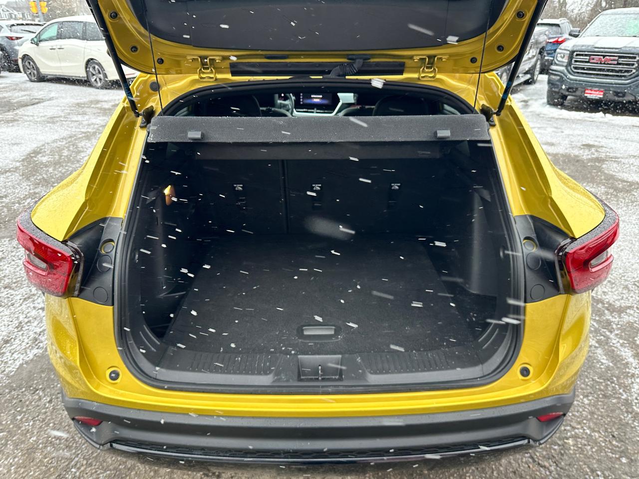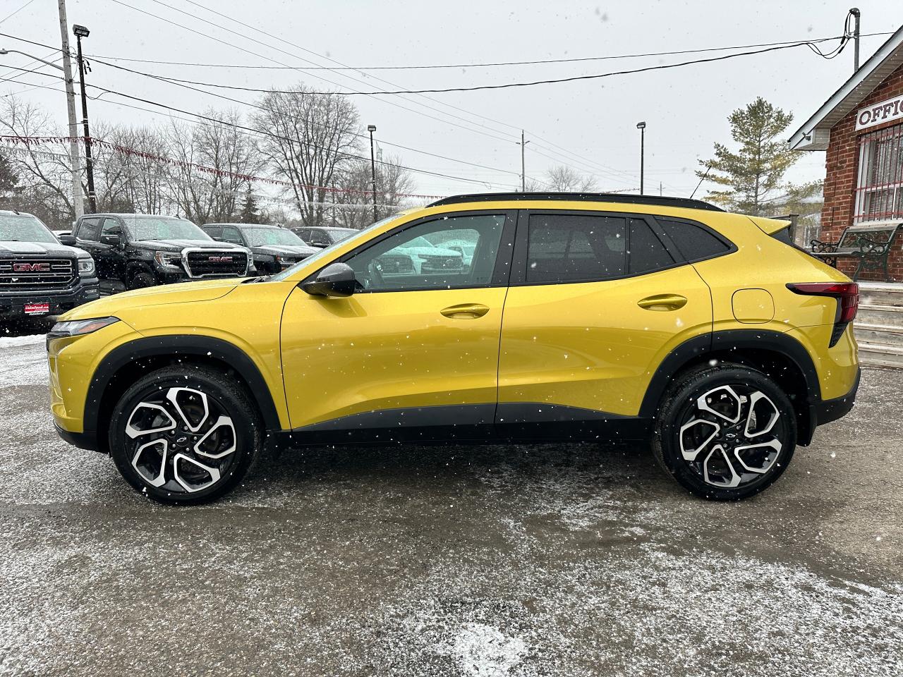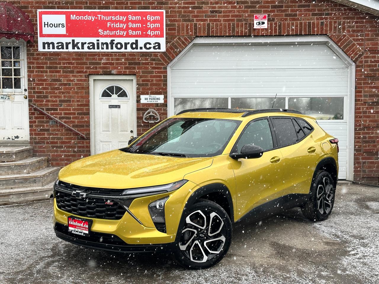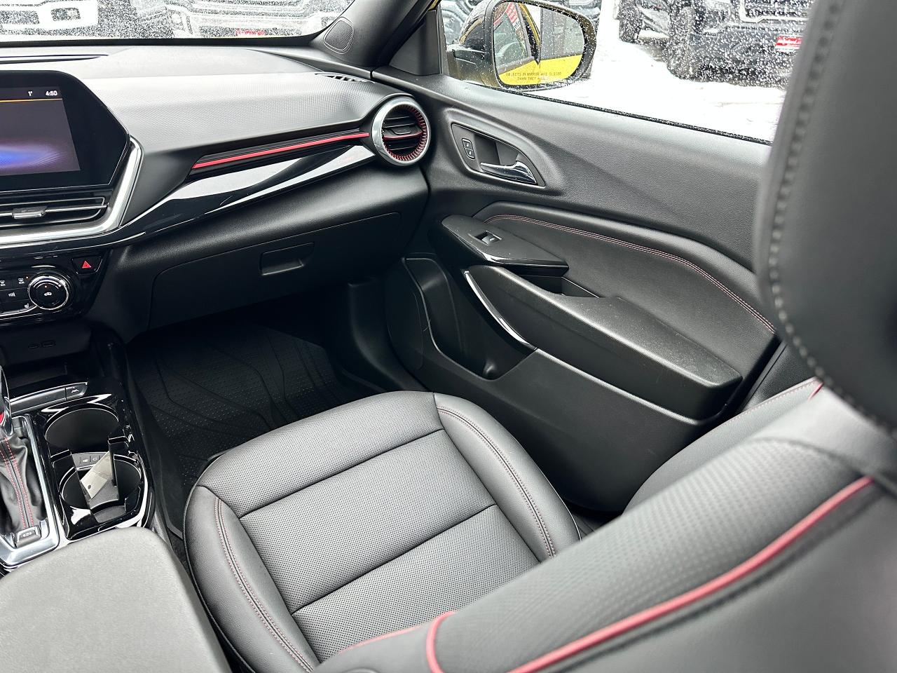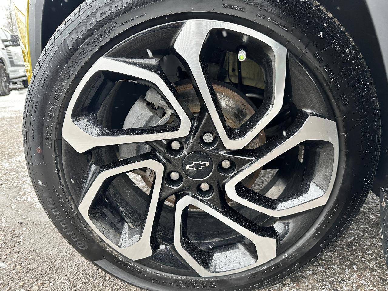 WOW! Ultra-Clean LOW KM Chevrolet Trax from Belleville, ON! This 2RS FWD model looks stunning in its shimmering Yellow paint and Factory Alloy wheels, with great options inside and out! The exterior features keyless entry with remote start and proximity key, a large factory power sunroof, automatic headlights/highbeams, black side mirrors and roof rack rails, forward collision warning, adaptive cruise and emergency braking, rear cross traffic alert, blind spot and lane keeping assists, tinted privacy glass, sleek rear spoiler and sharp overall exterior styling, gorgeous machine finished factory alloy wheels, a peppy fuel efficient 1.2L 3-Cylinder Turbocharged Engine and Automatic transmission! The interior is very clean and comfortable with heated leather front seats, all-weather floor mats, power door locks, windows and mirrors, comfortable rear seating and a spacious cargo area with a privacy shade, a heated leather wrapped steering wheel with Audio and Cruise controls, red accenting and stitching throughout the interior, a large easy to read guage display, push button start, a large central touch screen AM/FM/XM Satellite Radio with Bluetooth, Apple CarPlay, Android Auto, WiFi Settings, and Backup Camera, A/C climate controls with front and rear window defrost settings, USB/12V/USB-C accessory ports and more!